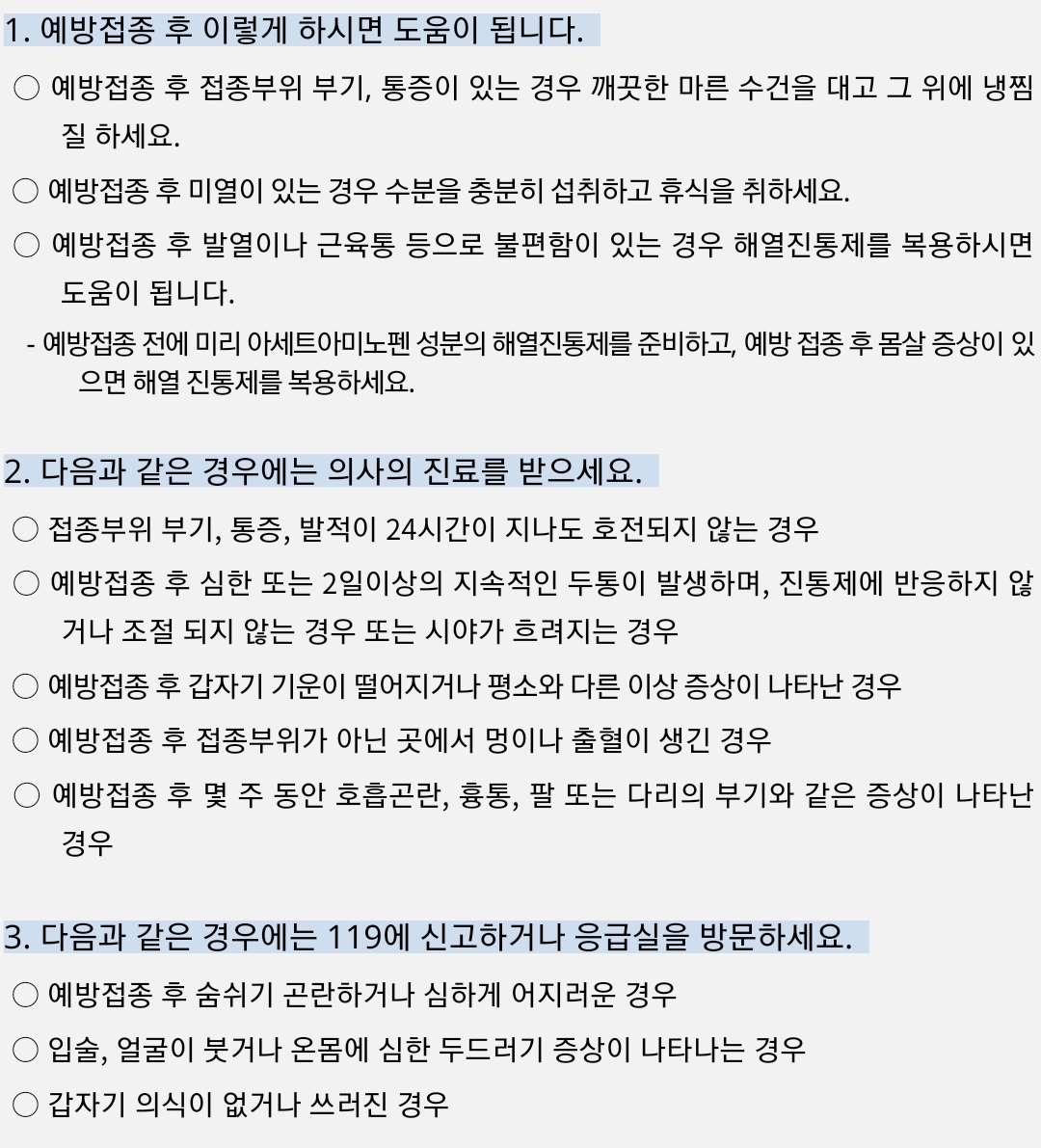 이상반응시 대응요령. 출처는 오늘자 정부 보도자료
