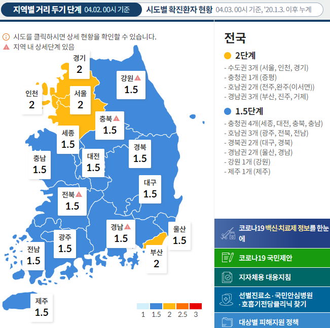 코로나19 집계(2021. 4. 3. 0:00 기준)/:/며칠동안 500명대 확진자가 나오기 시작하며 정부 담화문 발표 예정/:/정부, 2차접종시기를 약간 밀어 1차접종자를 최대한 늘리기로