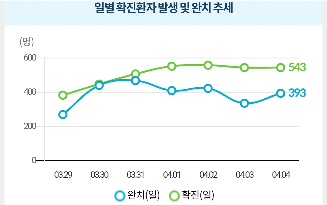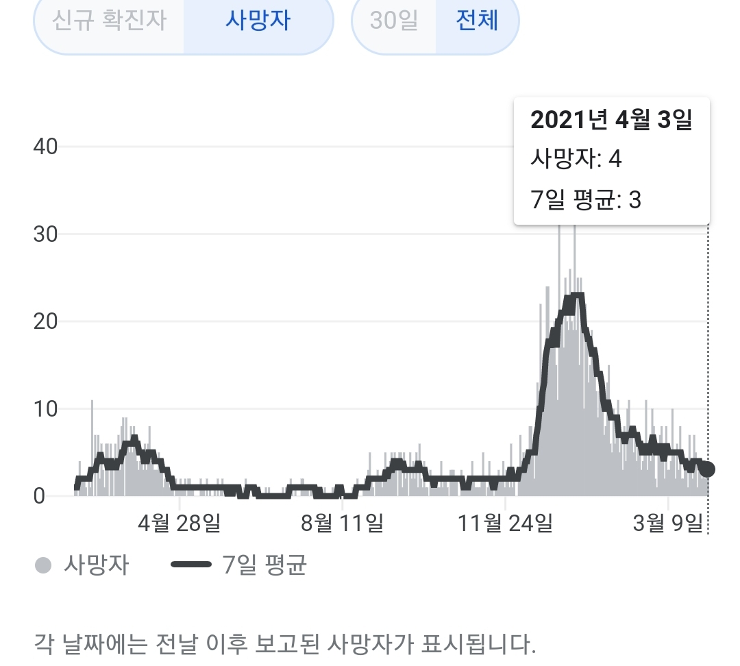 매일 정부 첫 발표는 오전 10시 전후해서 나오고, 그날의 확정발표 보도자료는 오후 2~4시 사이에 나오는 것 같더군요.1 구글 그래프는 미국 날짜가 바뀌는 오후 4~5시 정도에 갱신됩니다.