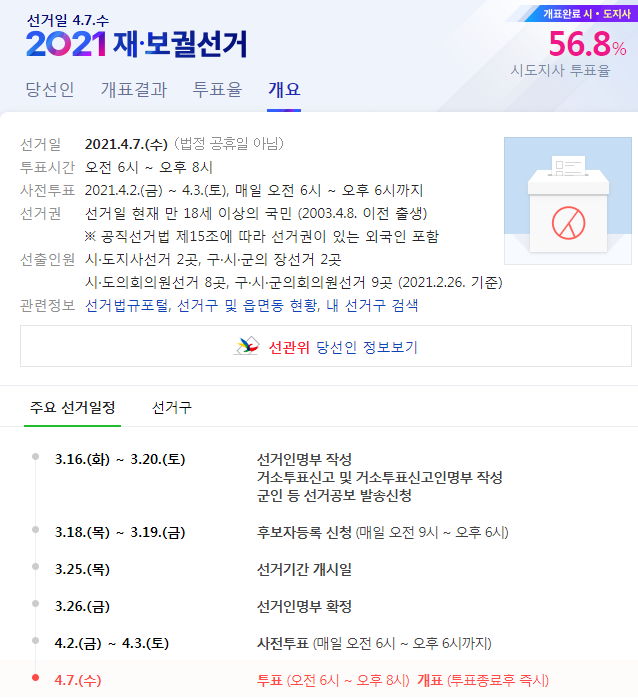 | 2021년 4월 7일 재·보궐선거, 투표소 찾기 (0) | 2021.04.07 |