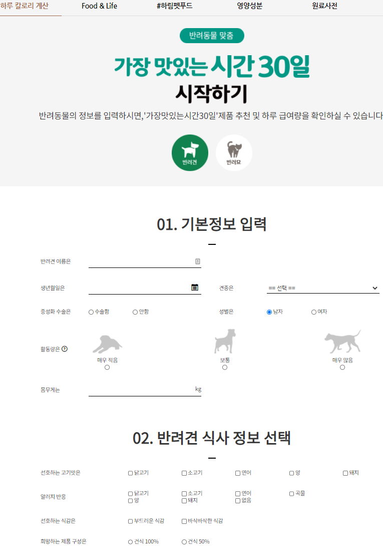 어느 반려동물사료회사 몰의 칼로리 계산기 본문
