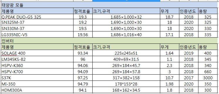 업체는 여러 곳입니다만, 사용하는 모듈과 인버터 제품은 아래와 같습니다.