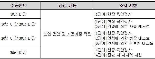 ⑤ 대상건물의 준공연도 확인 후 거치형 태양광 미니발전소 대상세대의 난간부 사전점검(난간대 설치된 실외기 등 기타 설치물 확인) 및 육안검사를 통해 설치여부를 판단하고 필요 시 지지력 시험 등을 진행하여야 한다.