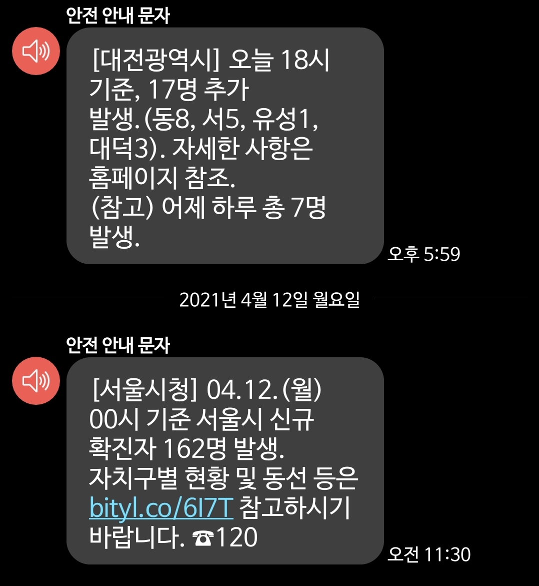 요즘 재난문자알림은 특별한 일이 없으면 하루 한 번.