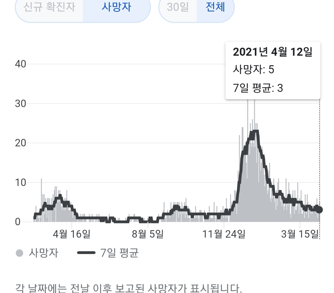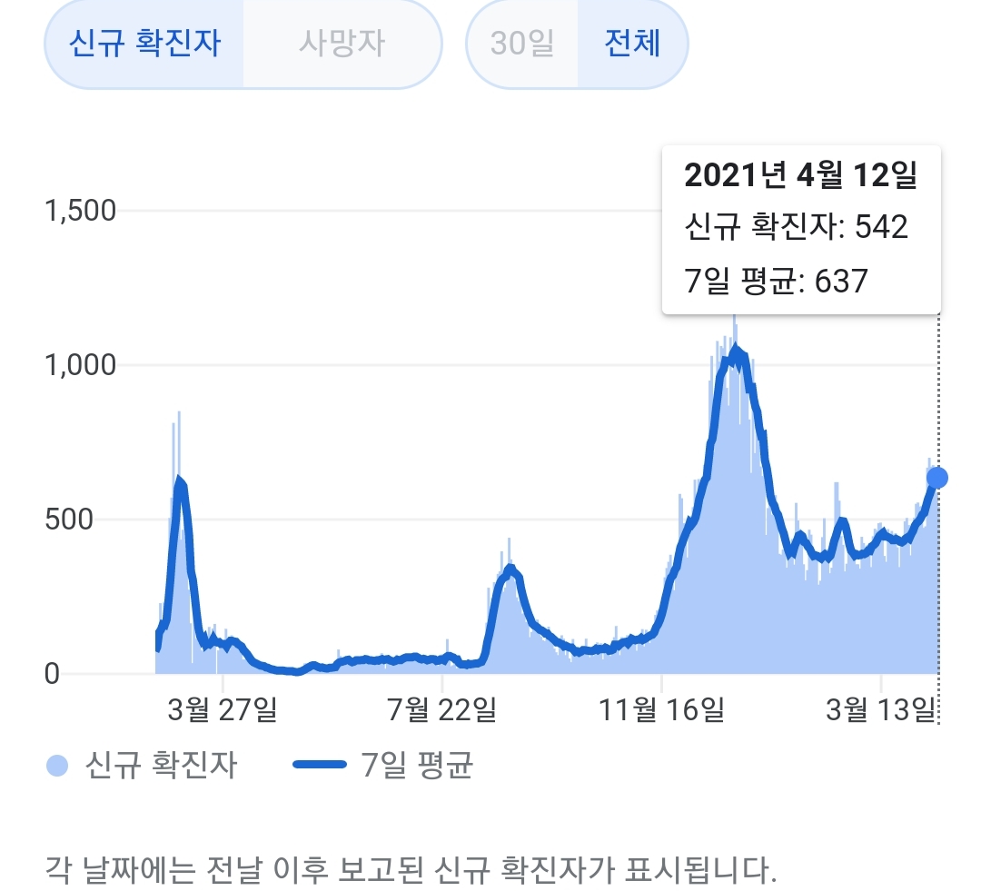 정부 첫 발표는 오전 10시 전후해서 나오고, 그날의 확정발표 보도자료는 오후 2~4시 사이에 나오는 것 같더군요.1 구글 그래프는 미국 날짜가 바뀌는 오후 4~5시 정도에 갱신됩니다.