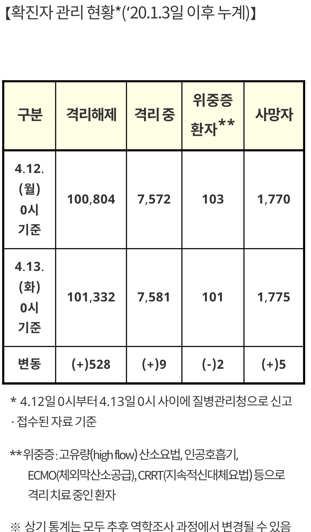 | 코로나19 집계(2021.4.12 0시 기준) (0) | 2021.04.12 |