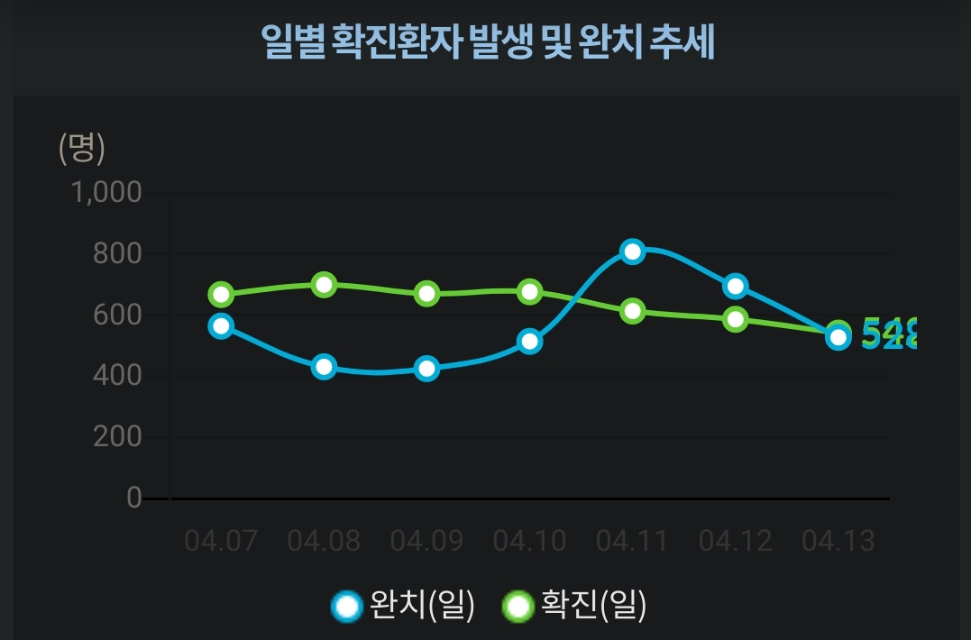 조금 진정세인가요? 어재보다 더 줄어서 550명 밑입니다.