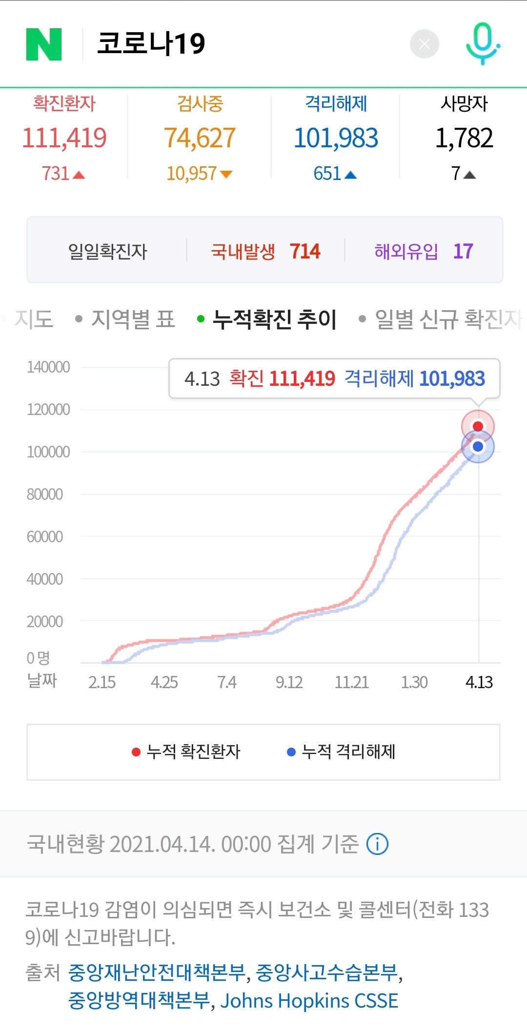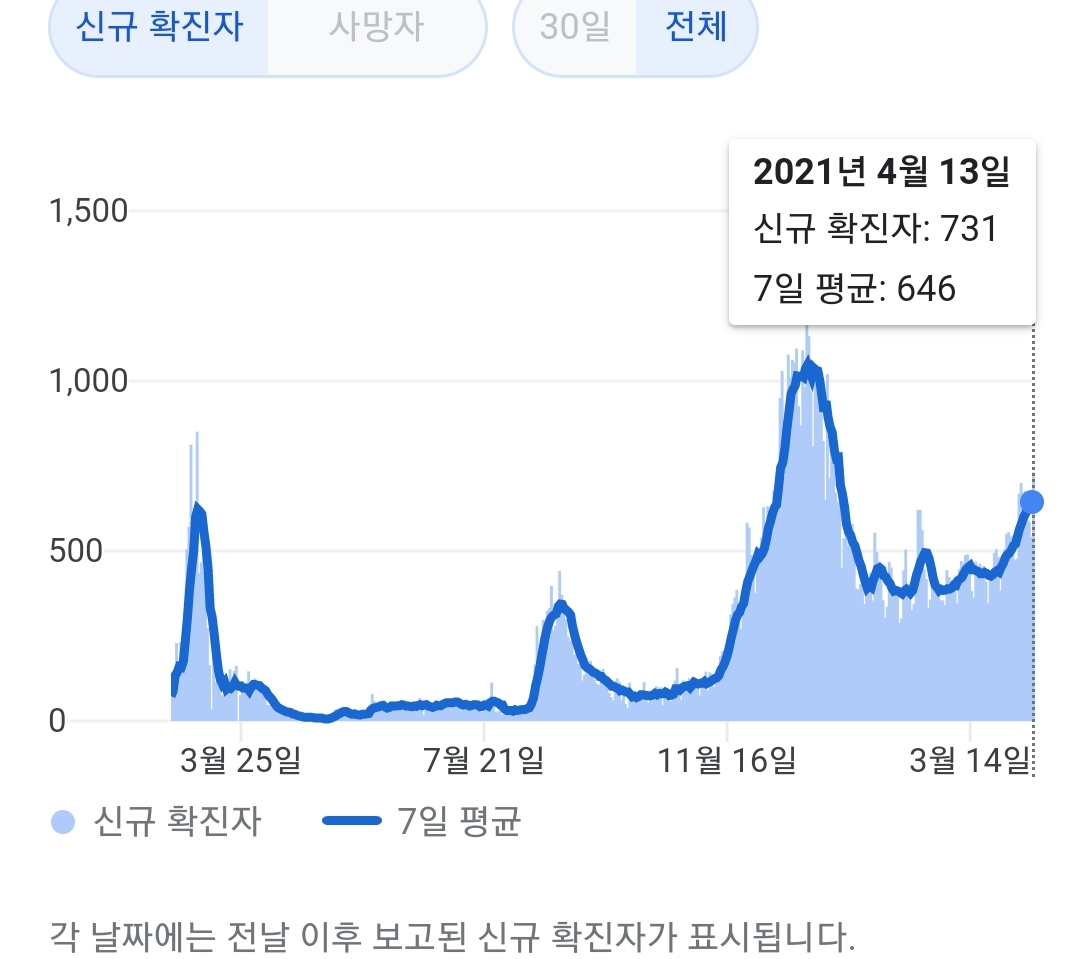 정부 첫 발표는 오전 10시 전후해서 나오고, 그날의 확정발표 보도자료는 오후 2~4시 사이에 나오는 것 같더군요.1 구글 그래프는 미국 날짜가 바뀌는 오후 4~5시 정도에 갱신됩니다.