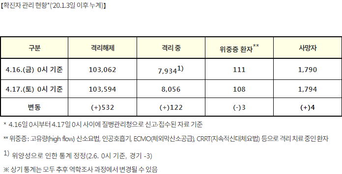| 코로나19 집계(2021.4.16. 0시 기준) (0) | 2021.04.16 |