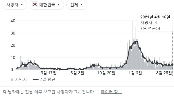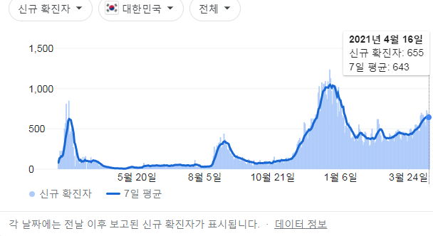 정부 첫 발표는 오전 10시 전후해서 나오고, 그날의 확정발표 보도자료는 오후 2~4시 사이에 나오는 것 같더군요.1 구글 그래프는 미국 날짜가 바뀌는 오후 4~5시 정도에 갱신됩니다.
