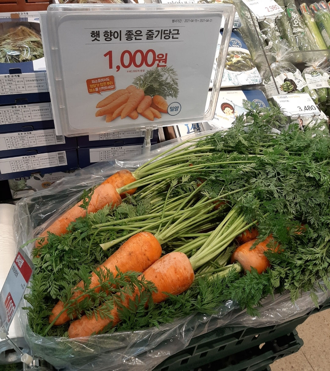 국산당근이라서, 마트기준으로 값도 이 크기에 이 정도면 괜찮죠. 아이들이 보면 신기해하거나 좋아할테고, 당근 잎줄기는 맛보다는 모양이지만 드레싱해서 샐러드로 먹을 수는 있습니다.