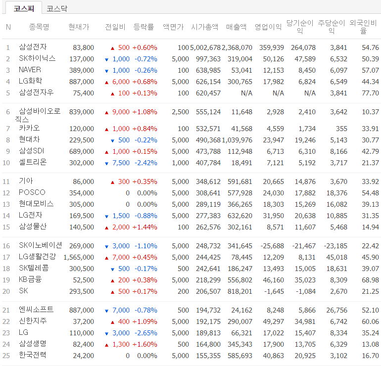 코스피, 코스닥 시가총액 상위 50위 회사들(2021.4.20) 본문