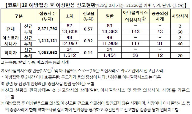 230만 명대입니다. 사망사례는 60건 집계됐습니다. 심사결과에 따라 백신탓이 아니라는 결론이 나오면 집계에서 삭제될 수 있습니다.
