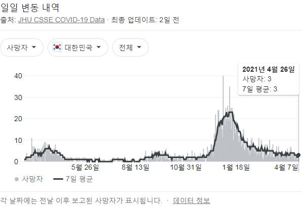정부 첫 발표는 오전 10시 전후해서 나오고, 그날의 확정발표 보도자료는 오후 2~4시 사이에 나오는 것 같더군요.1 구글 그래프는 미국 날짜가 바뀌는 오후 4~5시 정도에 갱신됩니다.