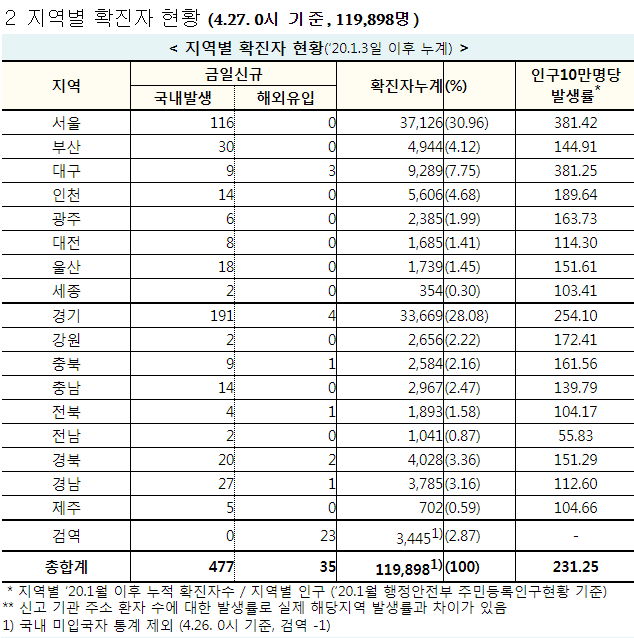 초기 대응이 미비했고 특수경로를 통해 퍼졌던 대구를 제외하면, 발생률은 10만 명당 100~150명 사이입니다.