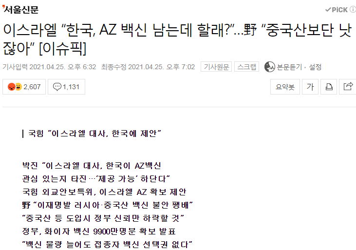 미국, 이스라엘은 백신을 외교력으로 사용하고 있습니다. 최소잔량주사기를 외교력으로 쓰려던 우리 정부의 수는 일단 실패한 모양이군요.