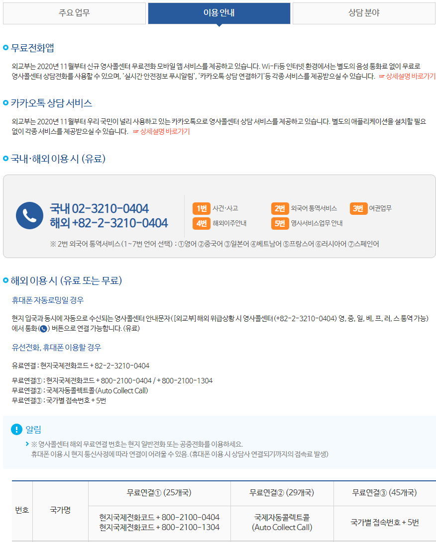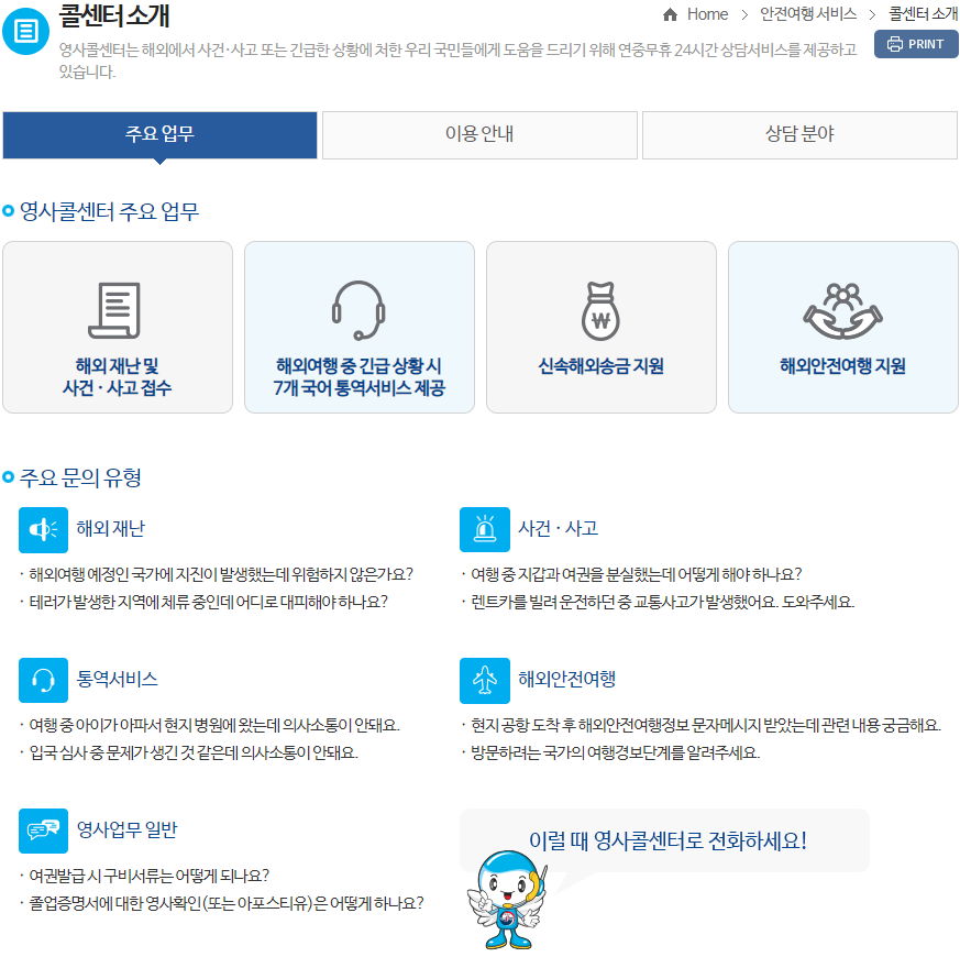 ㅡ 통역서비스(7개국어, 경찰, 출입국, 공항/교통, 병원, 숙소관련한 일부 범위)
