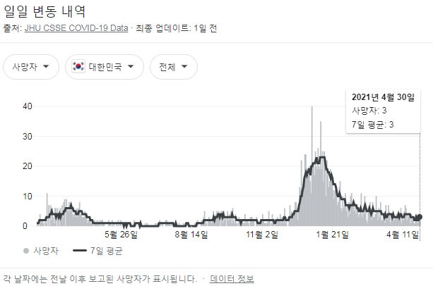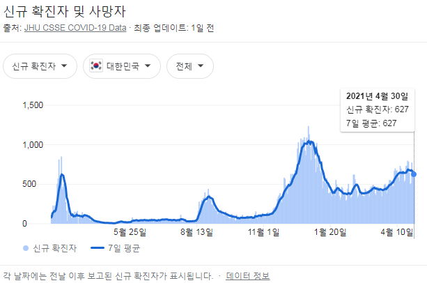 정부 첫 발표는 오전 10시 전후해서 나오고, 그날의 확정발표 보도자료는 오후 2~4시 사이에 나오는 것 같더군요.1 구글 그래프는 미국 날짜가 바뀌는 오후 4~5시 정도에 갱신됩니다.