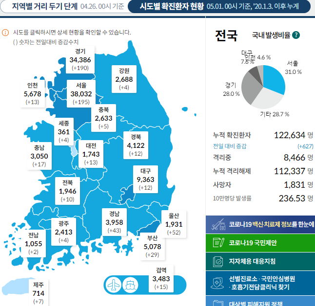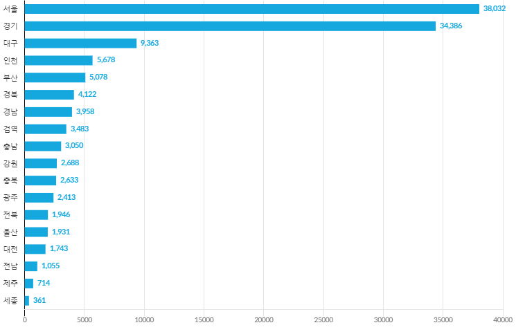 - 위 누적그래프에서는 대구가 3위지만 거긴 유행초기 재난에 가까웠던 특정경로 집단감염케이스였고, 점점 역학조사가 안 되는 케이스가 늘고 있는 지금의 추세를 볼 때는 예외로 치는 게 맞습니다. [본문으로]