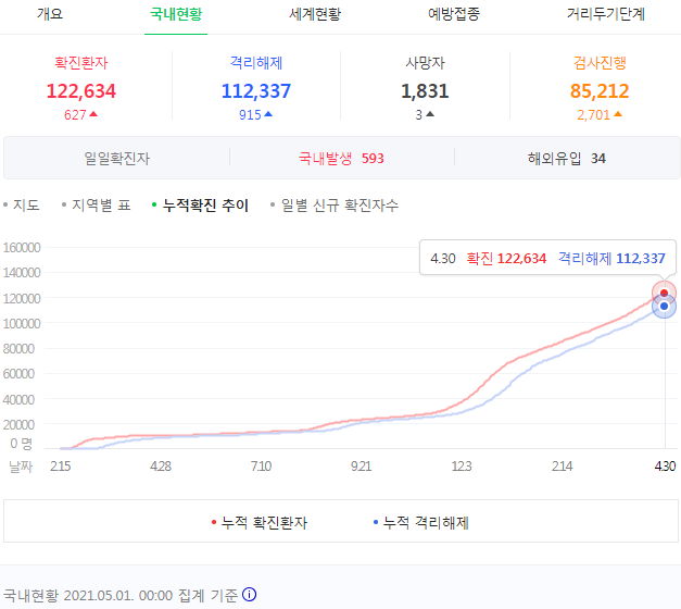 코로나19 집계(2021.5.1. 0시 기준)/:/ 627명 /:/ 5월 하순까지 지금 거리두기 유지. 7월부터 새 거리두기 계획 본문