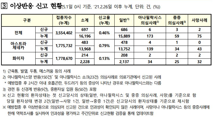 350만 명이 맞았고, 부작용사망자는 75명입니다.