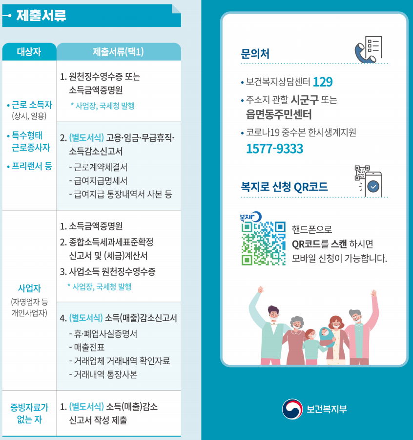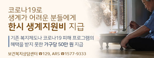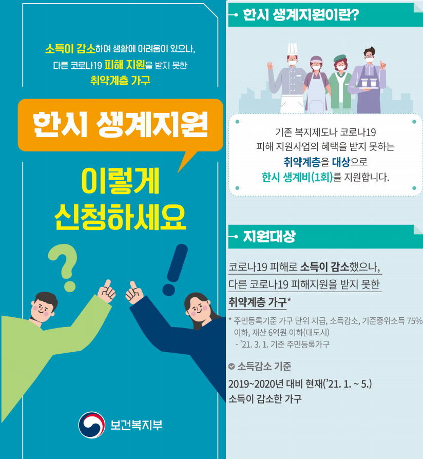 보건복지부, 신종 코로나바이러스 감염증(코로나19)으로 인해 생계에 어려움을 겪는 저소득 가구를 지원하기 위한 '한시 생계지원' 신청