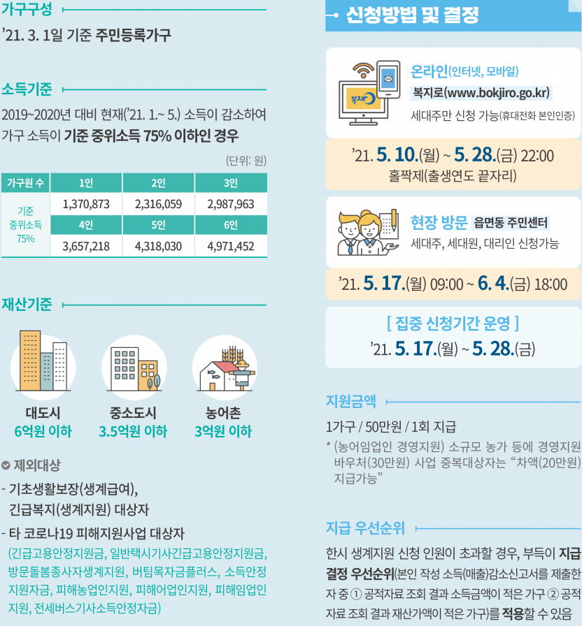 ㅡ 신청자격은, "가구원 중 한 명이라도 올해 1∼5월 근로·사업 소득이 2019년 또는 2020년보다 감소했고, 가구 소득의 합이 기준 중위소득 75% 이하이면서 재산 기준(대도시 6억원, 중소도시 3억5천만원, 농어촌 3억원 이하)" 조건.