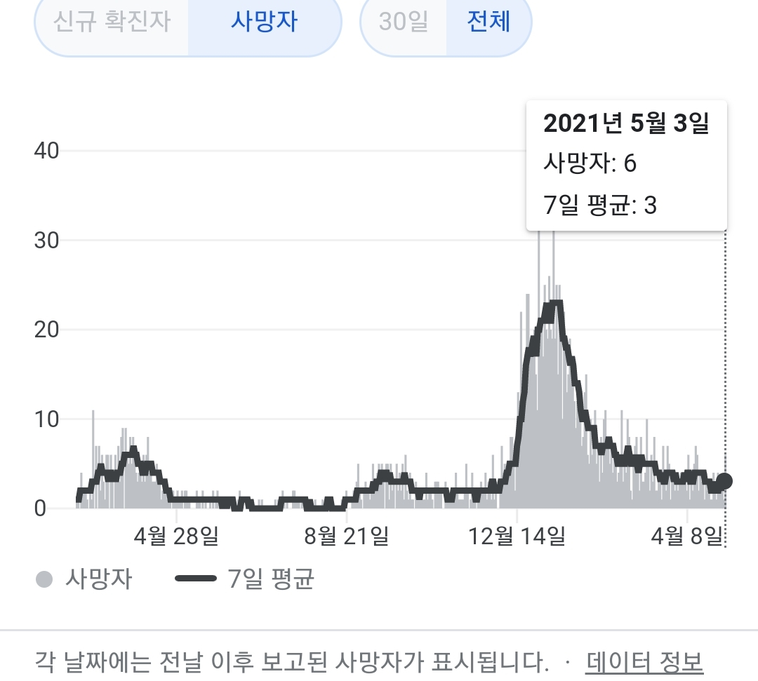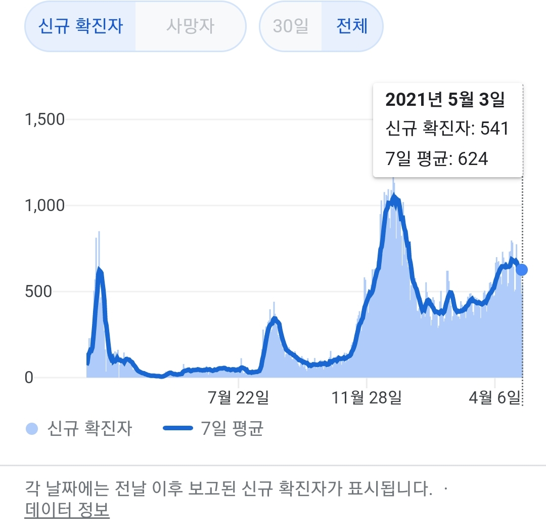 정부 첫 발표는 오전 10시 전후해서 나오고, 그날의 확정발표 보도자료는 오후 2~4시 사이에 나오는 것 같더군요.1 구글 그래프는 미국 날짜가 바뀌는 오후 4~5시 정도에 갱신됩니다.