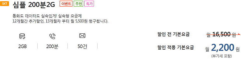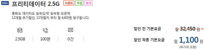 음성 100분, 데이터 2.5GB, 문자 0.. 월 1100원/12개월. -> 이후 월 4400원.
