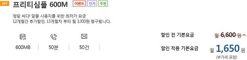 음성 50분, 데이터 600MB, 문자 50건 기본제공. 문자 50건에는 MMS(사진)포함.