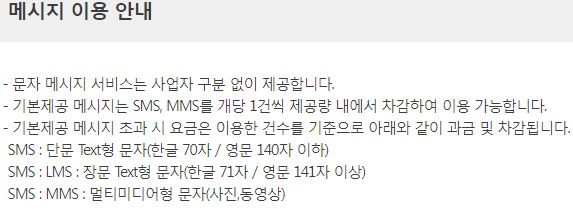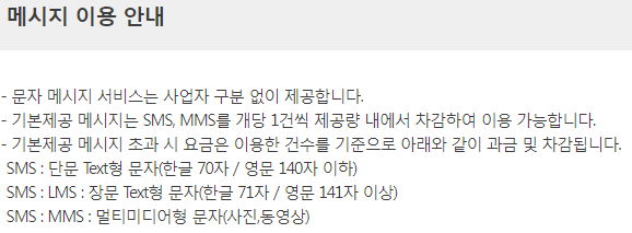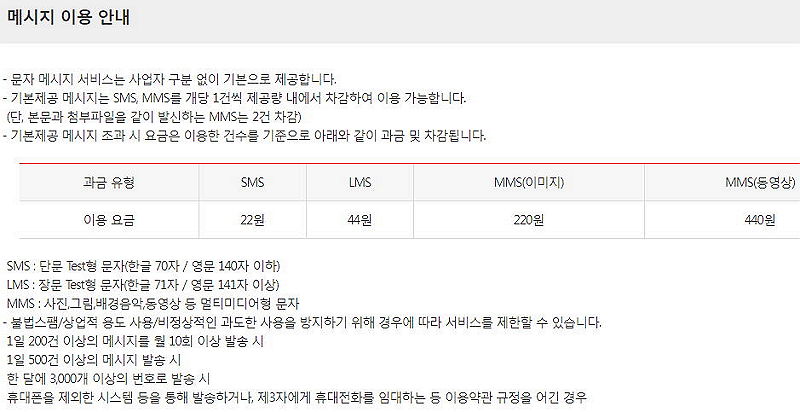 (MMS의 경우 텍스트+첨부이미지 구성으로 보낼 때 2건취급하는 상품이 있었는데 이 요금제는 어떨지 모르겠습니다. 그냥 나눠보내는 게 낫겠죠)