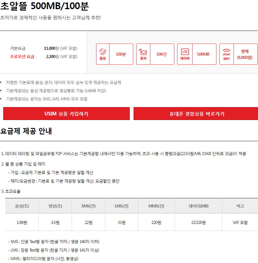 음성 100분, 문자 100건, 데이터 500MB.. 월과금 22000원.