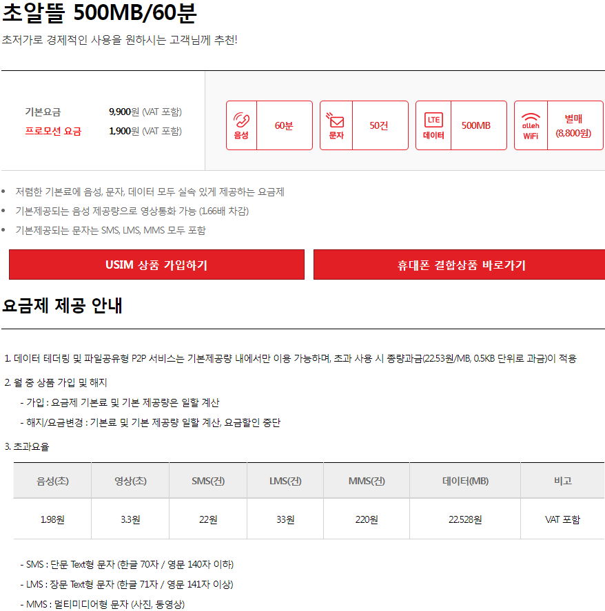 음성 60분, 문자 50건, 데이터 500MB.. 월과금 1900원.