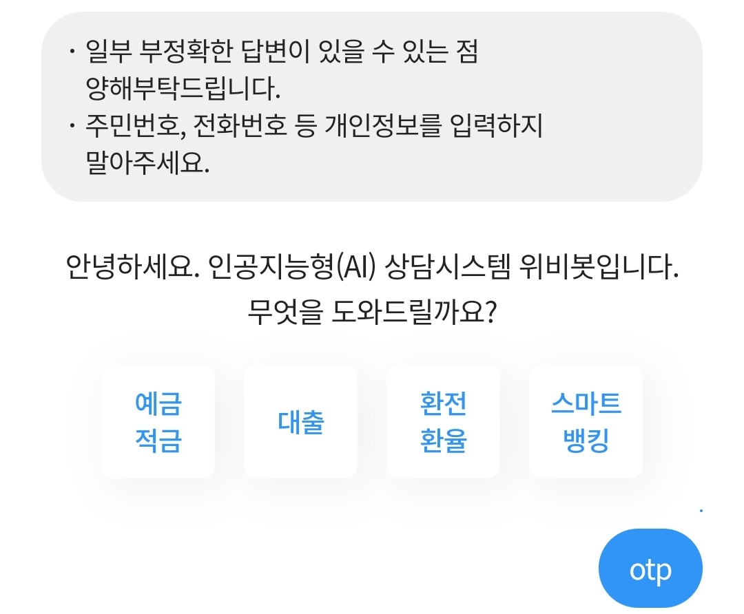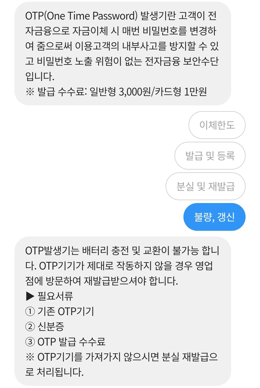 ※ 아래는 우리은행 위비톡 안내. 우리은행은 OTP불량시 보안카드를 사용할 수 있는데 일단 바꾸면 그 OTP는 우리은행에서 쓸 수 없고 새걸 받아야 한다니 보안카드와 병용은 불가능.