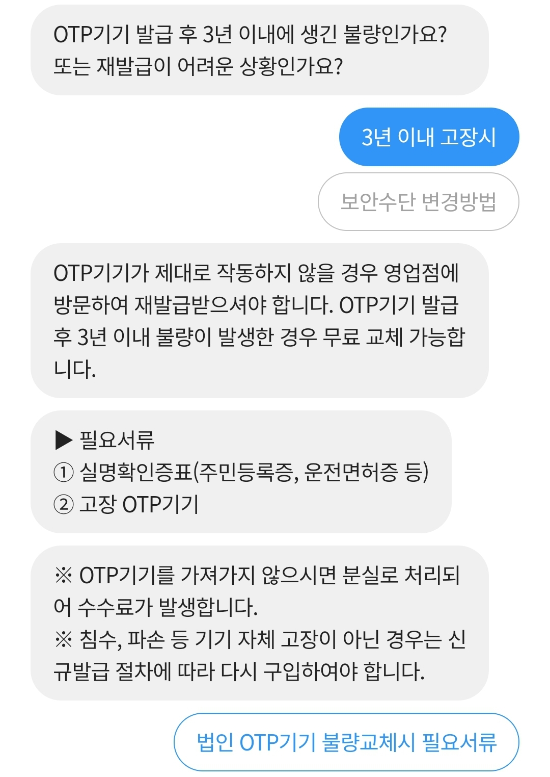 고장난 OTP기계는 3년 이내면 수수료없이 바꿔준다고 한다. 문제는 점포가 멀어..