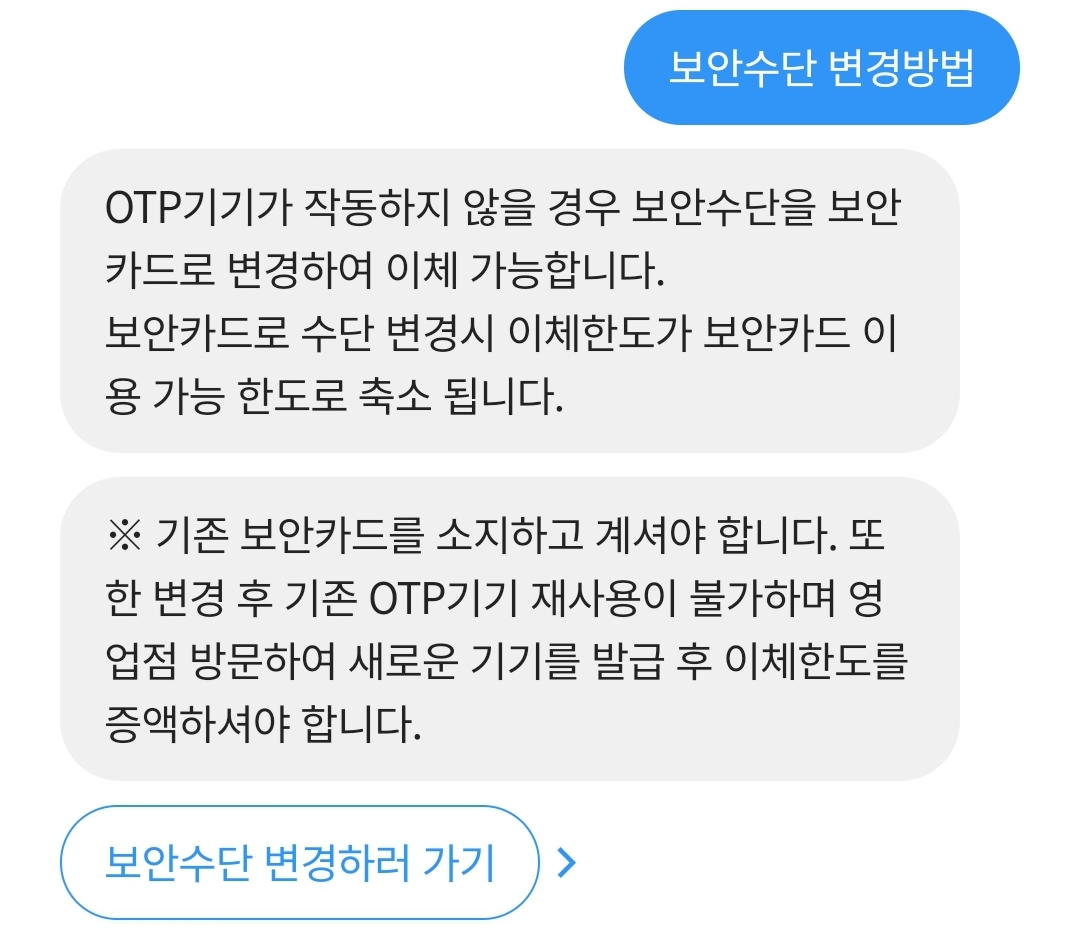 OTP카드가 고장난 날 급한대로 보안카드로 전환해 계좌이체를 했다.