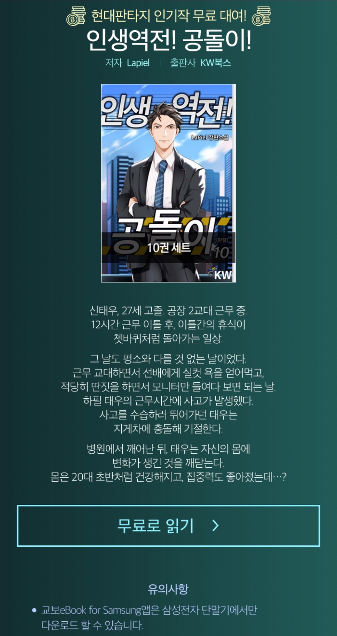 그 앱 속 메뉴에서 매월 1일에 지정된 전자책 한 권을 180일 무료대여로 받아 읽을 수 있습니다.