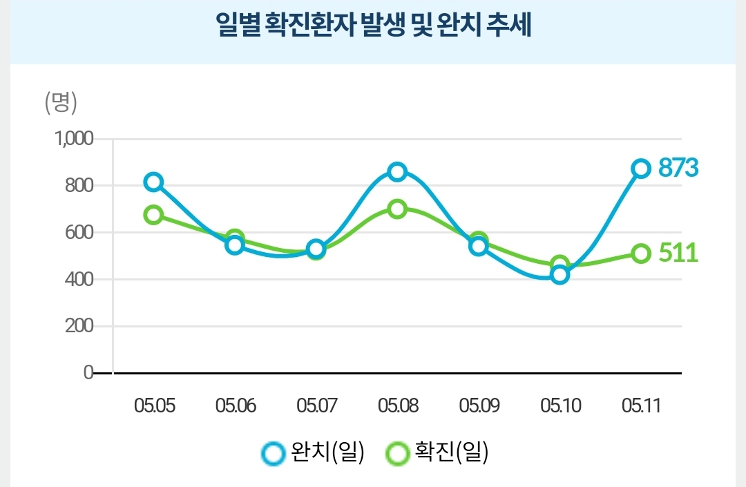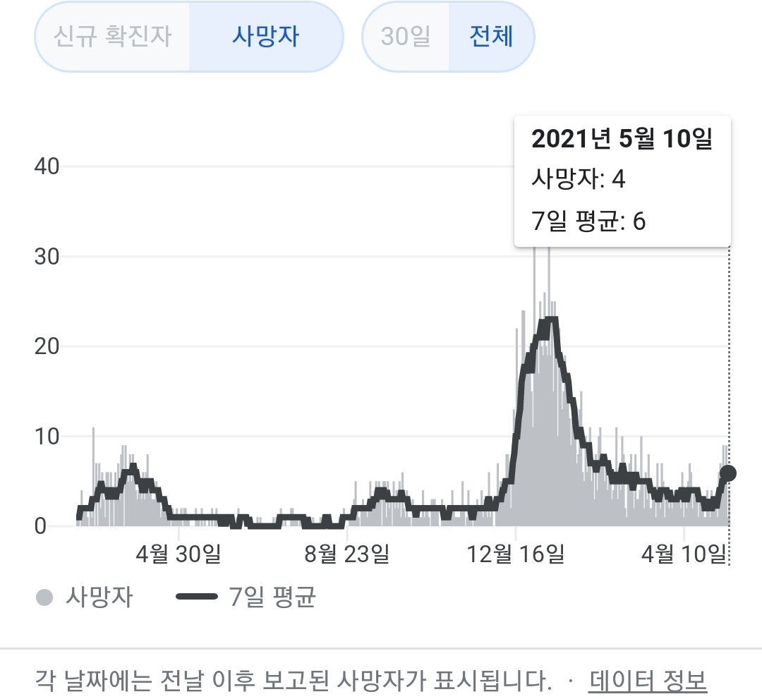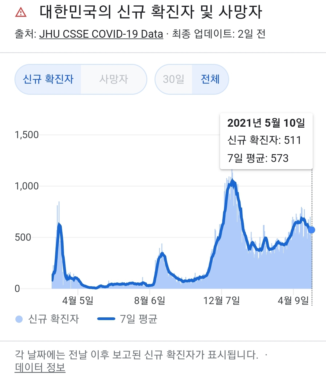 정부 첫 발표는 오전 10시 전후해서 나오고, 그날의 확정발표 보도자료는 오후 2~4시 사이에 나오는 것 같더군요.1 구글 그래프는 미국 날짜가 바뀌는 오후 4~5시 정도에 갱신됩니다.