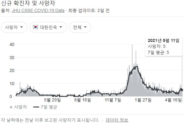 정부 첫 발표는 오전 10시 전후해서 나오고, 그날의 확정발표 보도자료는 오후 2~4시 사이에 나오는 것 같더군요.1 구글 그래프는 미국 날짜가 바뀌는 오후 4~5시 정도에 갱신됩니다.