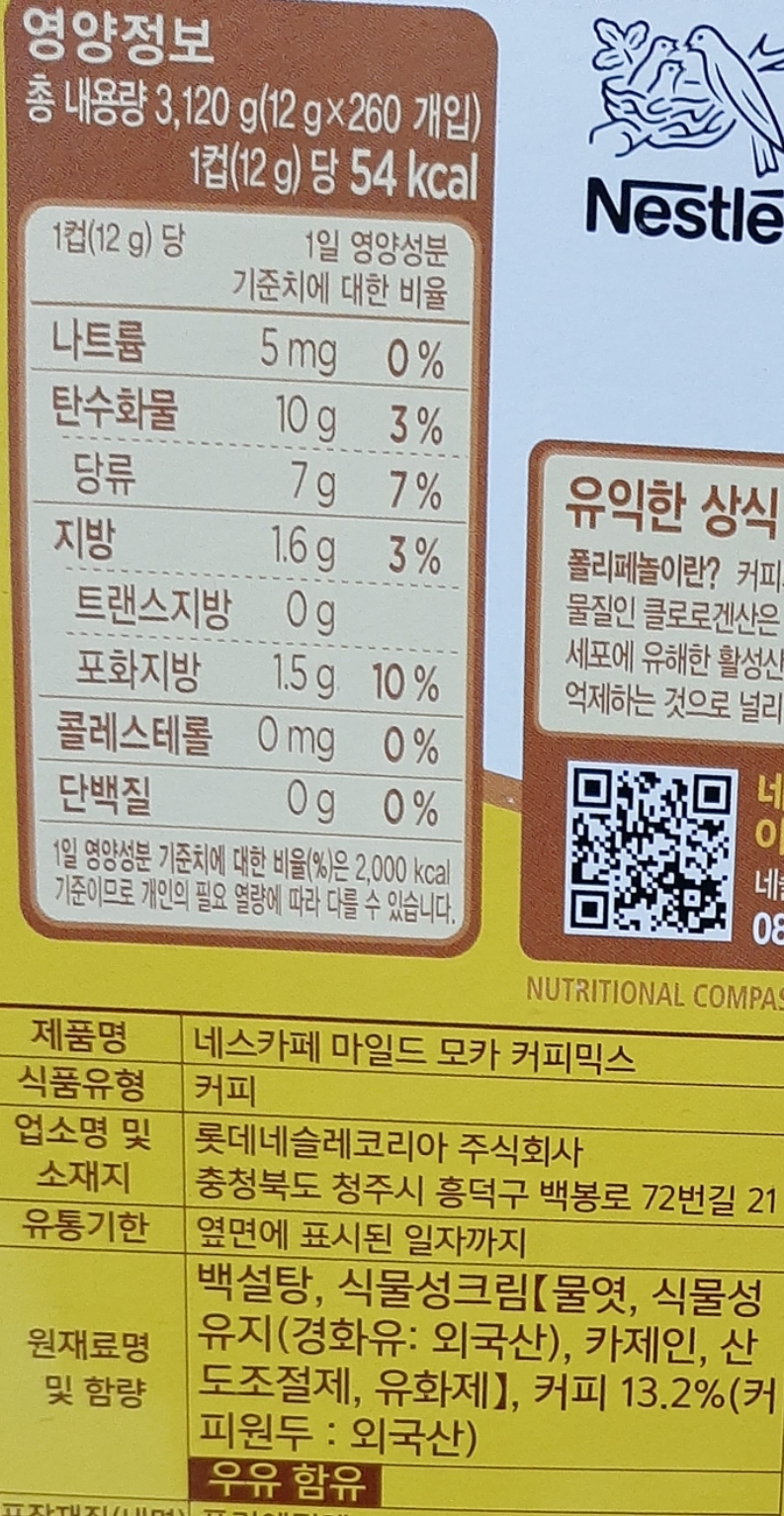 커피믹스가 으레 그렇듯, 그리고 모카커피믹스는 더 그렇듯, 설탕과 물엿이 많이 들어가고, 식물성 경화유(흔히 말하는 커피프림 성분)이 들어갑니다. 건강을 생각한다면 드신 후 입도 헹굴 겸 맹물을 한 잔 더 드시는 게 좋습니다.