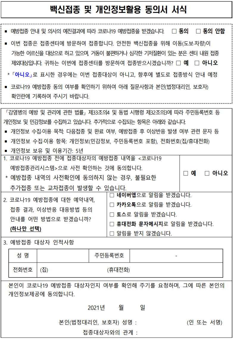 그리고 75세 이상 고령인 어르신이나, 특정질환이 있어 요구되는 경우에는(아래 스크린샷에 나오듯이 "대상"이 구별되어 ㅇㅆ습니다), 동의서를 작성하고 보호자를 동반해야 예방접종을 맞을 수 있습니다.