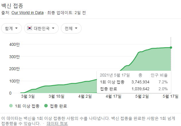 | 코로나19백신, 미국인구 1/3은 2차 접종완료, EU인구 1/3은 1차 접종완료. (0) | 2021.05.19 |