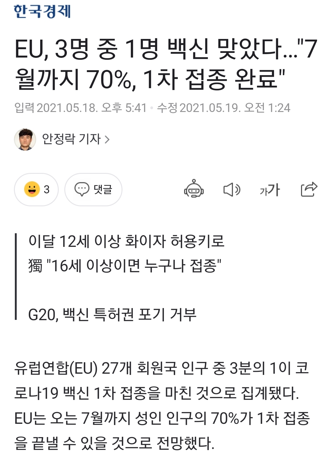 코로나19백신, 미국인구 1/3은 2차 접종완료, EU인구 1/3은 1차 접종완료. 본문
