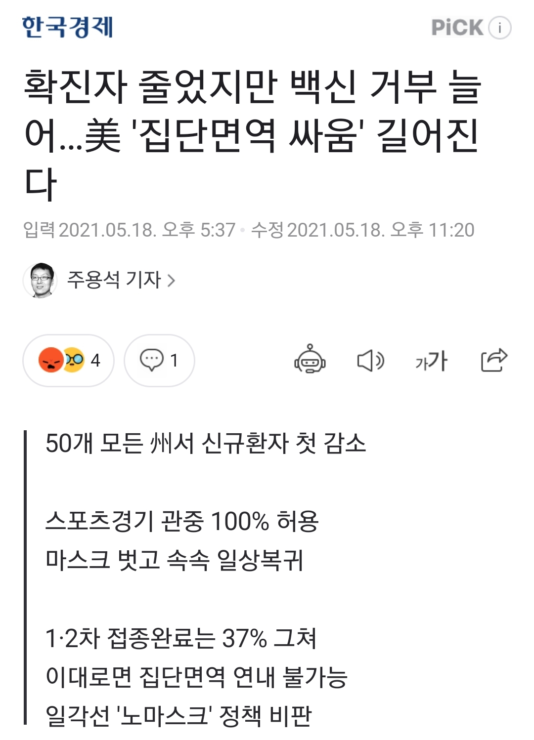 확진자 줄었지만 백신 거부 늘어…美 '집단면역 싸움' 길어진다