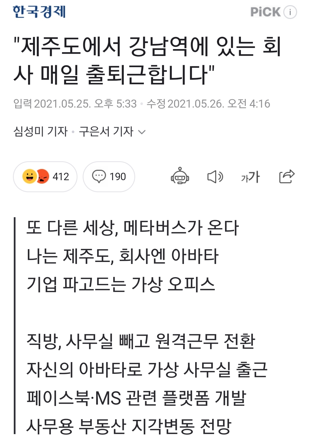 ㅡ “지금까지는 테헤란로에 있어야 좋은 인재를 뽑을 수 있었지만, 메타버스 오피스에서 일하는 게 자연스러워지면 비싼 임차료를 지급하며 요지에 사무실을 낼 필요가 없어질 것”