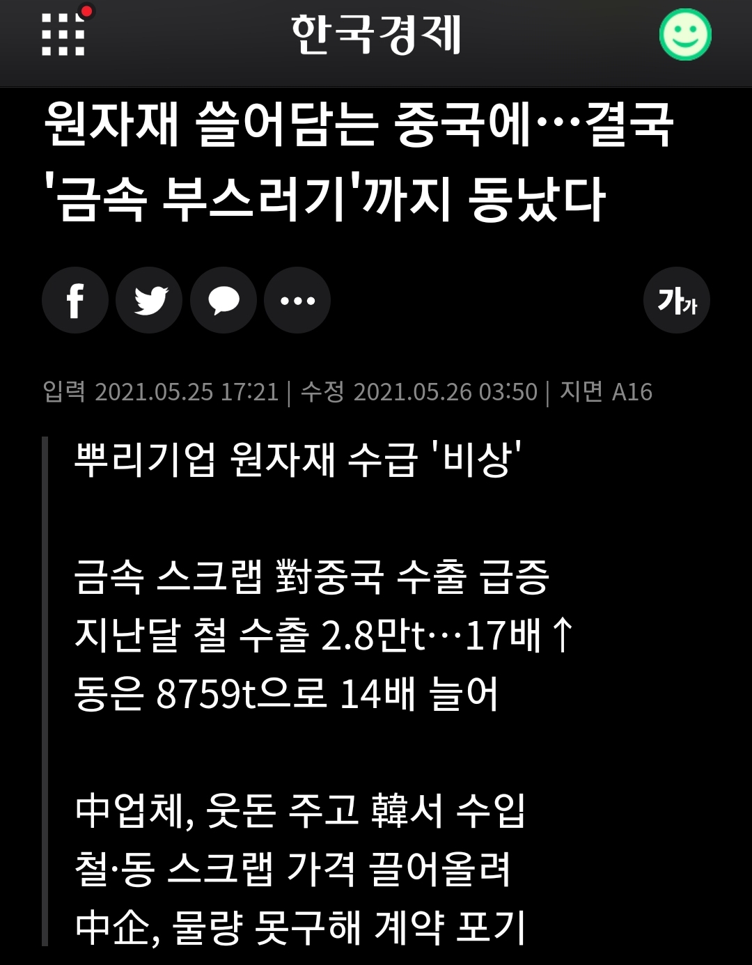 원자재 쓸어담는 중국에…결국 '금속 부스러기'까지 동났다 , 뿌리기업 원자재 수급 '비상' 금속 스크랩 對중국 수출 급증 지난달 철 수출 2.8만t…17배↑ 동은 8759t으로 14배 늘어 中업체, 웃돈 주