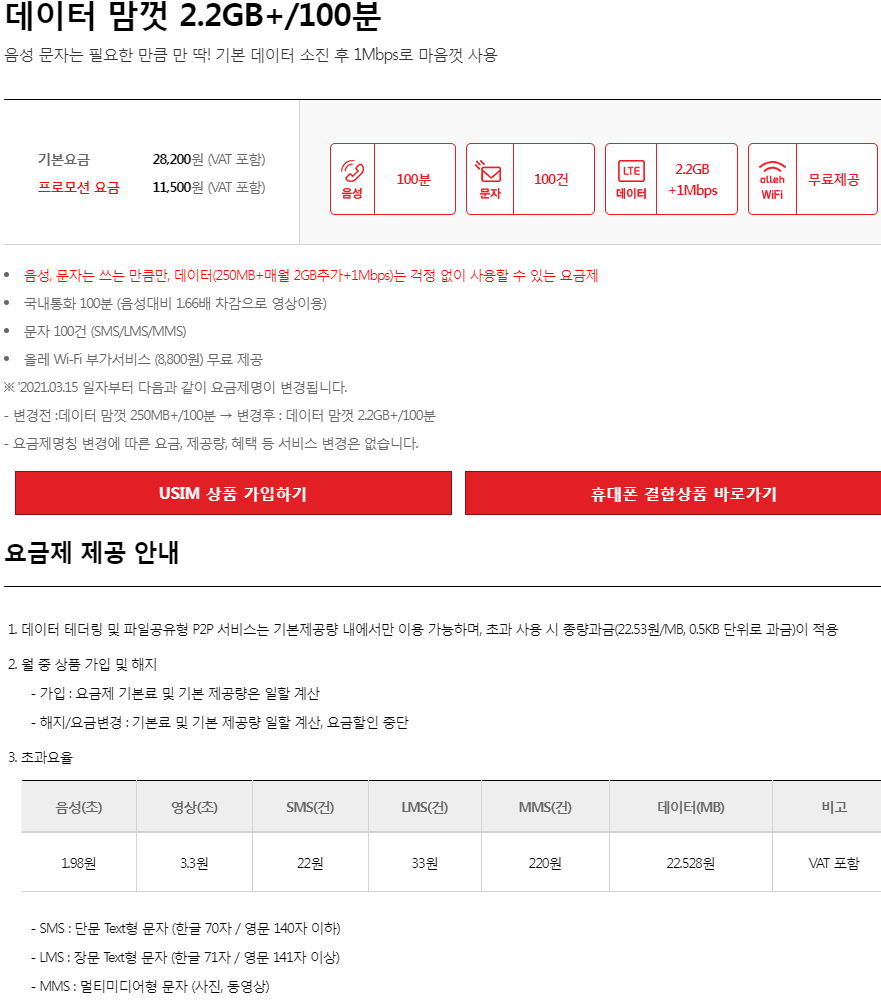 데이터 맘껏 2.2GB+/100분, 11500원.