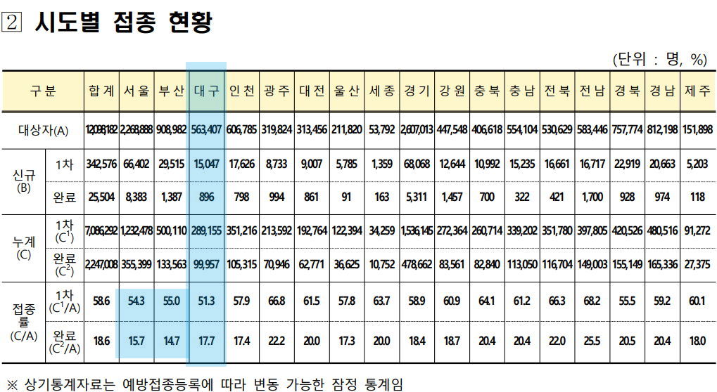 어느 기사에서는 대구지역의 다른 문제로 고령층 백신 접종률이 낮다고 하는데.. 이건 줄세우니 그렇다는 얘기같고 그렇게 큰 차이는 아닙니다. 아래는 오늘 발표자료.
