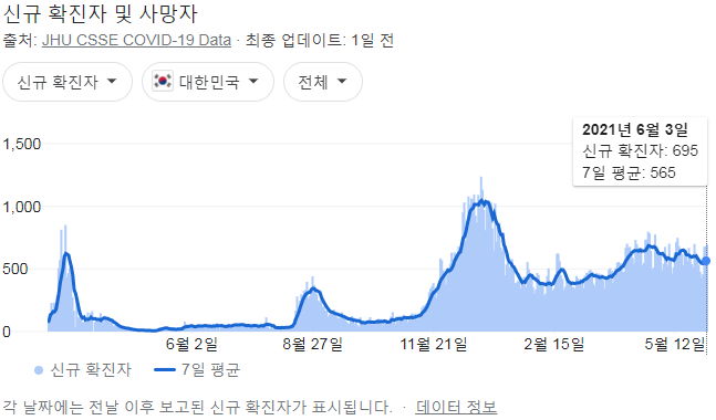 정부 첫 발표는 오전 10시 전후해서 나오고, 그날의 확정발표 보도자료는 오후 2~4시 사이에 나오는 것 같더군요.1 구글 그래프는 미국 날짜가 바뀌는 오후 4~5시 정도에 갱신됩니다.
