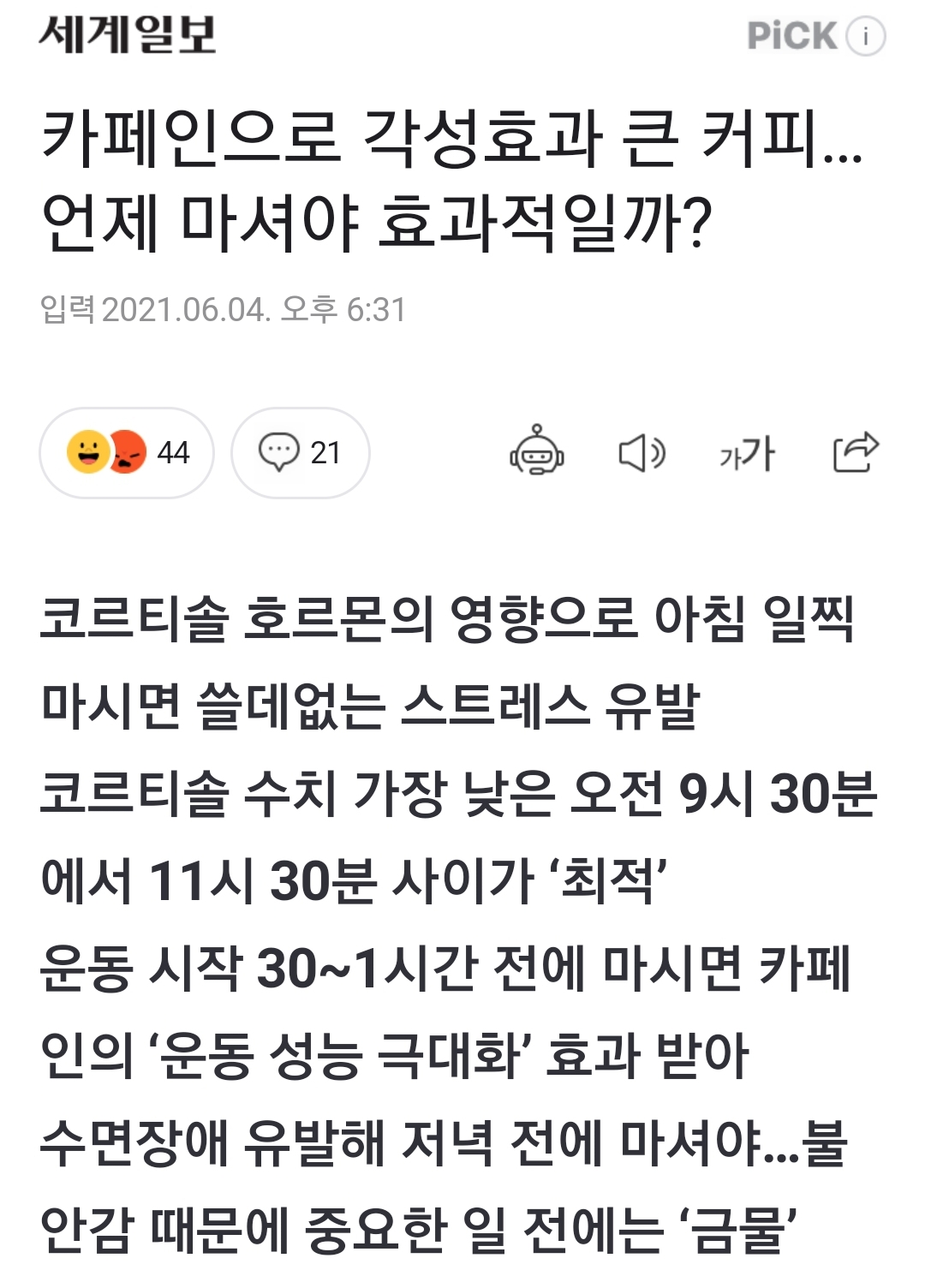 코르티솔 호르몬의 영향으로 아침 일찍 마시면 쓸데없는 스트레스 유발 코르티솔 수치 가장 낮은 오전 9시 30분에서 11시 30분 사이가 ‘최적’ 운동 시작 30~1시간 전에 마시면 카페인의 ‘운동
